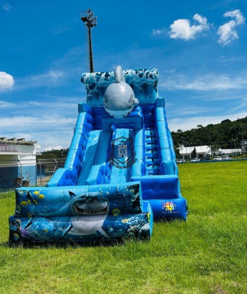 O Toboshark Tobogã é a atração perfeita para quem busca aventura, adrenalina e muita diversão! Com um visual marcante, esse brinquedo inflável chama atenção por onde passa: ele é todo em tons de azul, com design temático de tubarão e fundo do mar, ideal para encantar crianças.